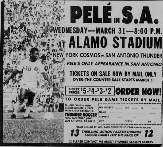 One memorable game was when Pele came to town with the New York Cosmos to play the San Antonio Thunder, and faced Bobby Moore for another contest between the two stars. The game at the Alamo Stadium was won by the Thunder 1-0.