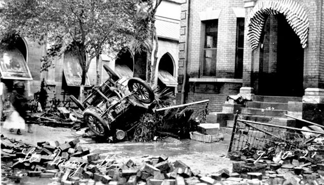 Oil from pump houses was swept up in the torrent, leaving high-water marks on buildings. The river was littered with debris such as furniture, pianos, lumber, vehicles, dead animals, even partial buildings, and when this all became trapped under bridges, the water was sent surging even higher into the city.