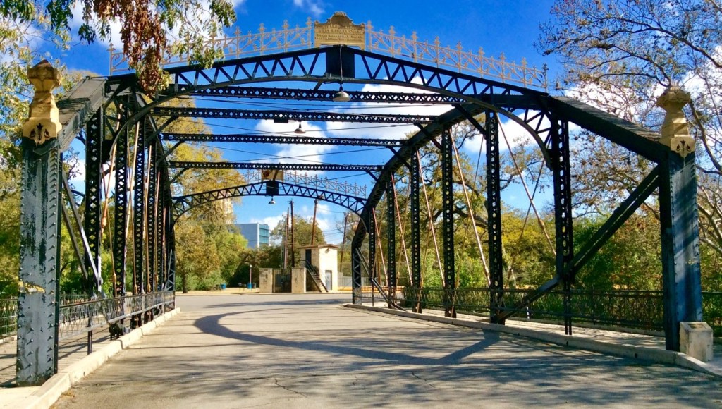 Following the flood, the “Letters of Gold” bridge was dismantled, and now is located at Brackenridge Park.