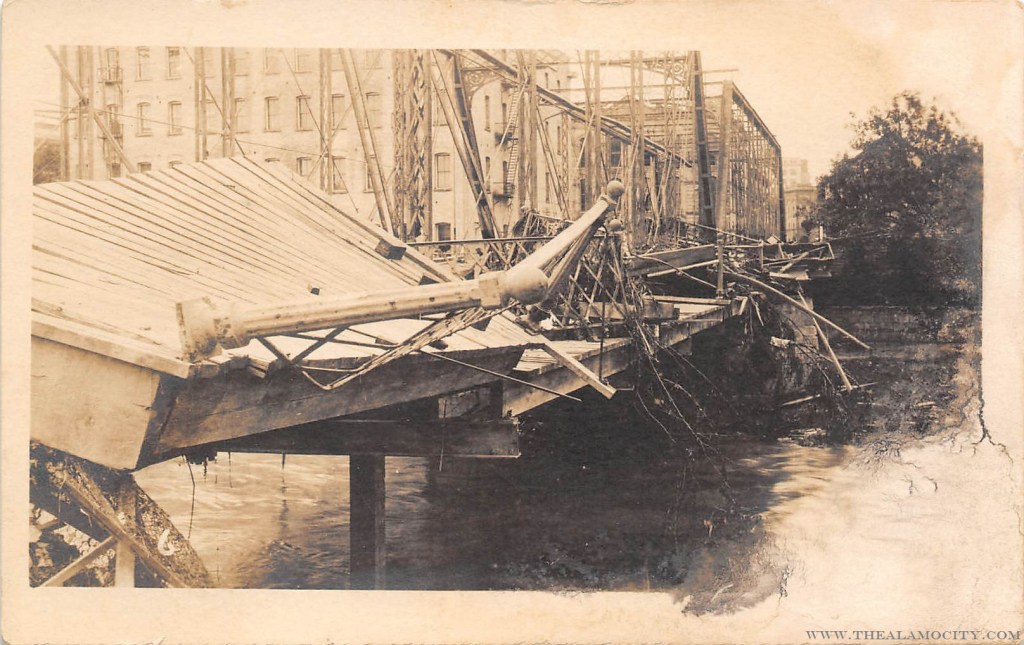 Prior to the 1921 flood, the bridge spanning the San Antonio River at North St. Mary’s Street was referred to as the “Letters of Gold” bridge. It was a feature of the city. At the top of the bridge, there was a gold-colored plaque with inscription and gold ornamentation at each end of the bridge. The plaque above the span featured the name of the bridge builder (Berlin Iron Bridge Company — East Berlin Connecticut), the engineer of the city ( Paul Pretzer ), the name of the Mayor ( Bryan Callaghan ) and the date of construction ( 1890 )
