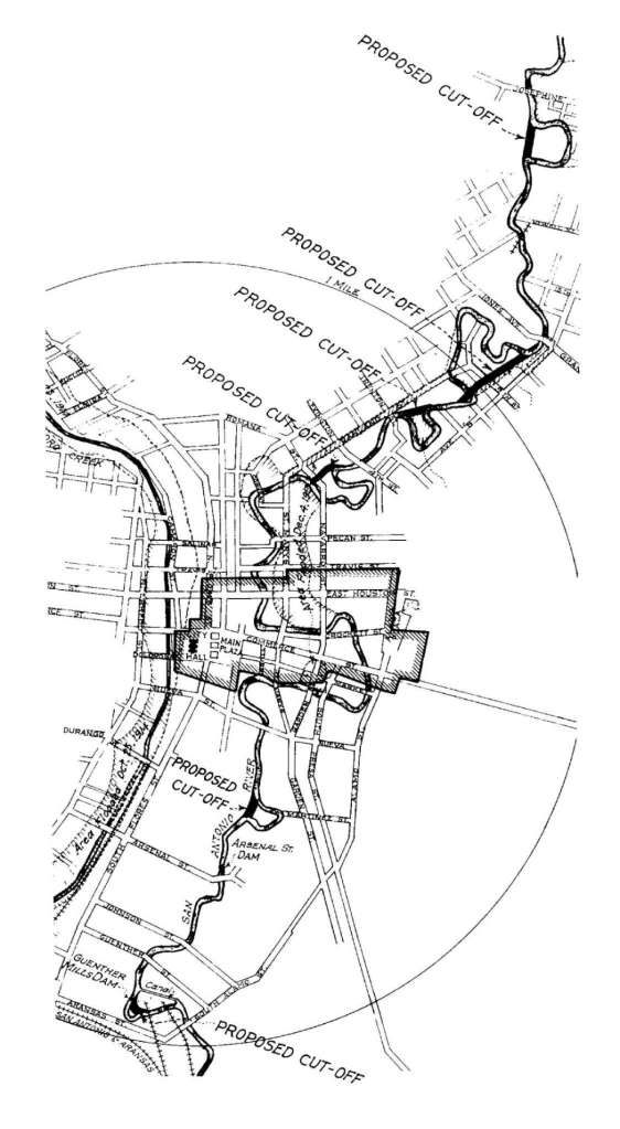 One of the twisting bends was almost 1,500 feet of winding river north of Navarro Street that would be straightened to allow the construction of the Municipal Auditorium…now the site of the Tobin Center.
