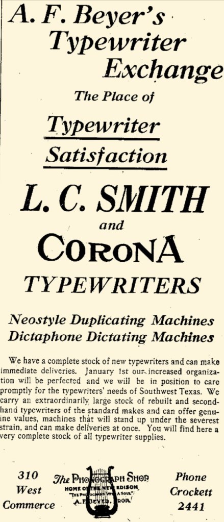 Alfred Frederick Beyer was born in 1891 in San Antonio, and his early career was as a typewriter mechanic. However, the repairman’s bench did not satisfy him, or appeal to him as a long-term career, because he had a determination and passion for business. He had little money, but he possessed an abundance of character, skill and determination, and in 1912, at the age of 21, Alfred Beyer opened a modest typewriter exchange and repair shop. Originally a one-man operation, it slowly grew, and over time, moved to a couple of smaller locations around town, before it expanded into a substantial business which was situated at 310 W. Commerce Street . . . not far from the San Fernando Cathedral.