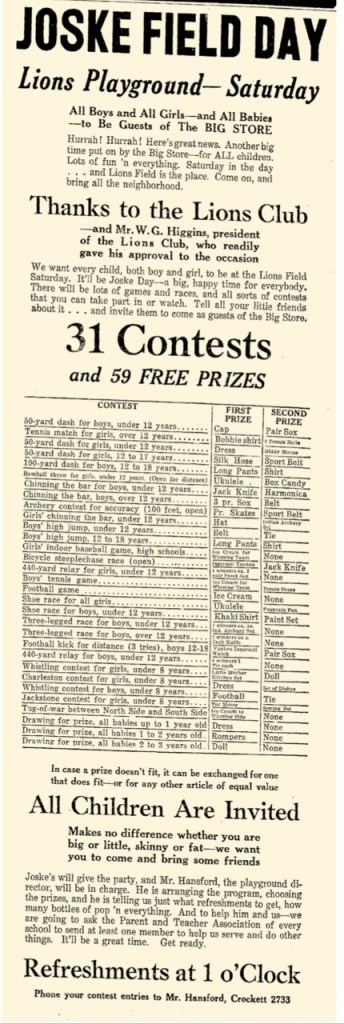 Here’s an advertisement promoting the huge occasion, and detailing the array of prizes on offer for all the events that day. All kids were invited.