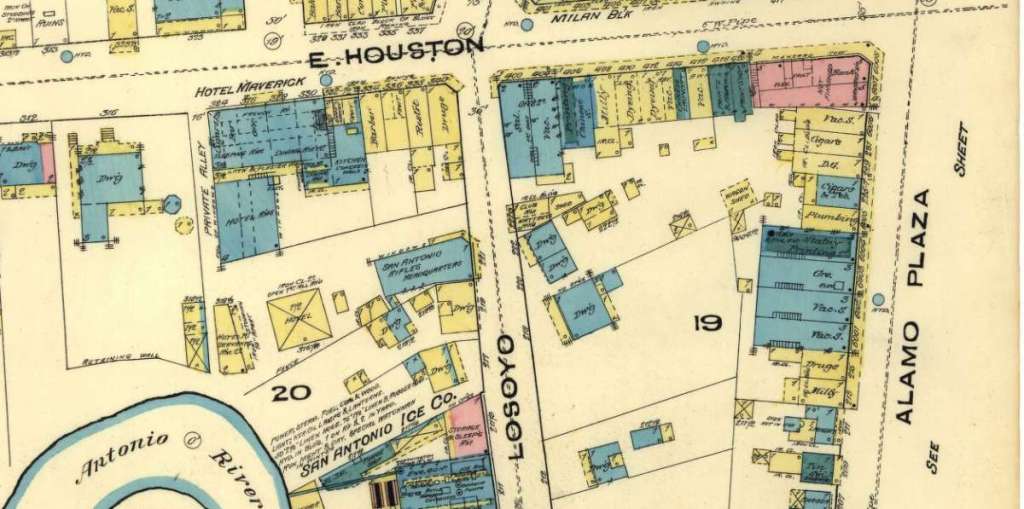 The “San Antonio Ice Company” was located on the banks of the San Antonio River at Losoya Street, just north of Crockett Street, close to where the Hyatt Regency Hotel and “Mad Dogs and Englishmen” stand today.