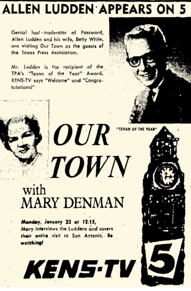 That night, during a banquet in the Anacacho Room at the St Anthony Hotel, Allen Ludden was presented with the “Texan of the Year” award by the Texas Press Association. At the ceremony, also attended by Betty White, over 300 newspaper men and women honored Allen Ludden with the TPA’s highest award. At the award ceremony, the TPA President Jim Barnhill praised Allen Ludden, citing him as one “who both in person and on the air frequently and proudly refers to Texas as his home state. He has given the Lone Star State millions of dollars in publicity”