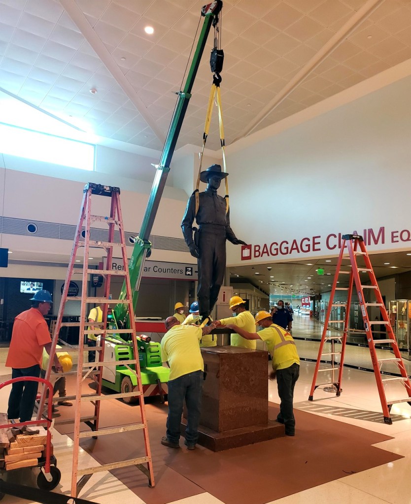 In June 2020, Dallas authorities removed the Waldine Tauch statue of a Texas Ranger which had been located in the main lobby of the Love Field airport. Due to protests, according to an airport spokesman, the statue was placed in storage with its fate to be decided by the Dallas Office of Arts and Culture. The 12 foot high bronze statue had been there since 1963.