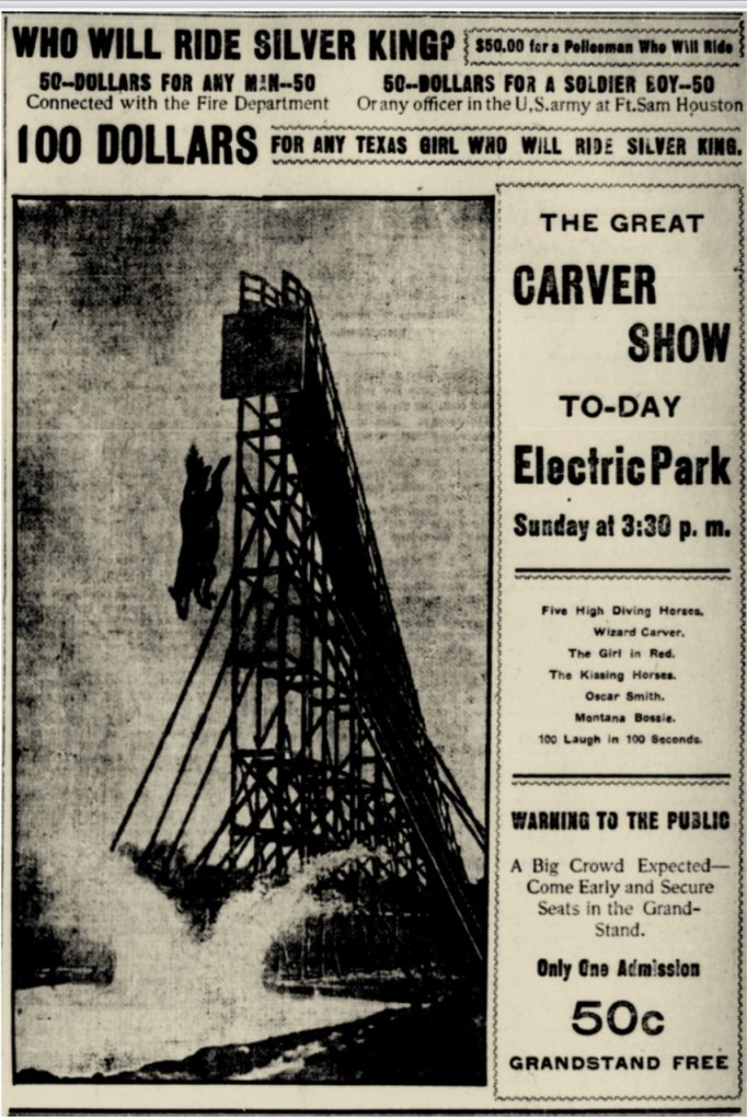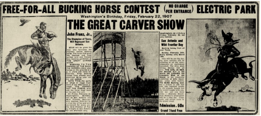 William “Doc” Carver earned his nickname after earlier becoming a dentist, and had since become a very accomplished marksman. Following the Cody breakup, “Doc” Carver created another touring show featuring his shooting exhibitions and a number of trained performing animals. The act that gained the most attention, and notoriety, was the diving horse performance, and Doc Carver’s “Diving Horse Show” had now come to San Antonio for a one month season.