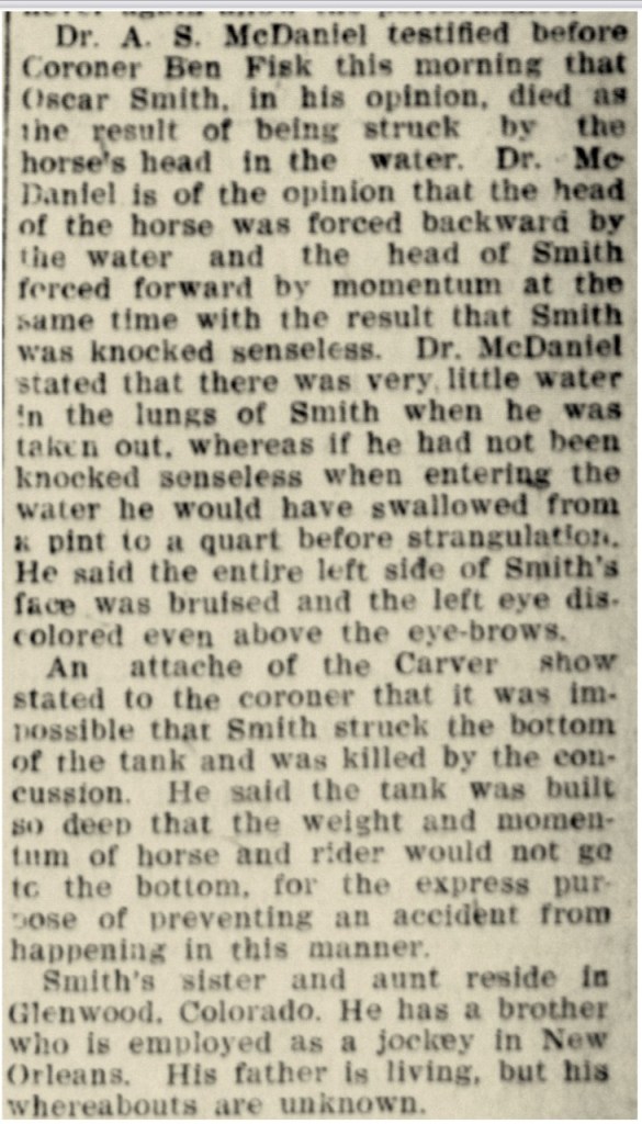 Men jumped into the pool and brought up Oscar’s lifeless body. When he was brought from the pool, upon examination, a large bruise was found over his left eye. It was assumed that the injury had been caused by a kick from the horse. However, “Doc” Carver maintained that it was impossible for the horse to have struck him, and he claimed that Oscar Smith had died of a heart attack in the air while plunging into the pool.