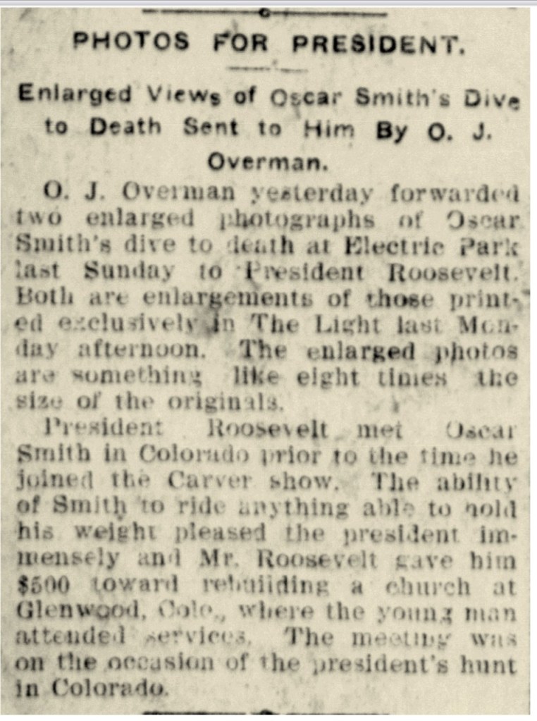 - Oscar Smith had met President Roosevelt in Colorado before joining the Carver show. The photographer who snapped the last photo of Oscar Smith as he plunged towards the pool, and which had appeared on the front page of the sold out newspaper the next day, sent a copy of the photo to the President.