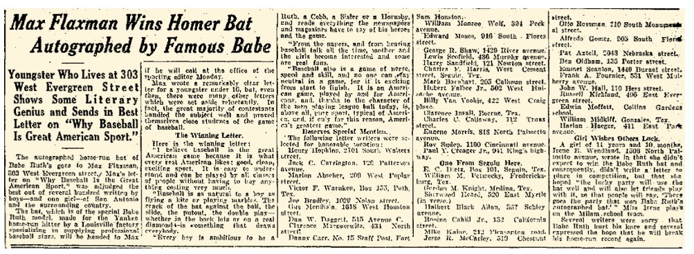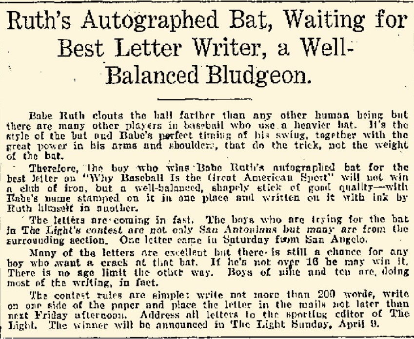 Leading up to the big game, the San Antonio Light newspaper held a competition to win a signed Babe Ruth bat. Interesting that in the story below, the bat apparently would be won by a boy.