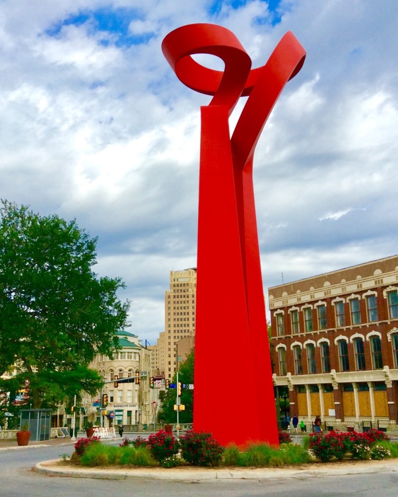 Standing 65’ tall, and weighing 45 tons, the sculpture is now a landmark of San Antonio at the intersection of Alamo, Losoya, and Commerce Streets, a block from the Alamo, and beside the Riverwalk.