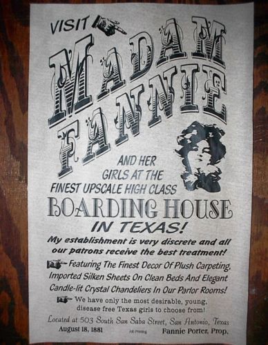 Fannie had proved herself to be a shrewd businesswoman, had saved her money, and had enough resources to open her own bordello in a building that had been constructed in 1883. Fannie Porter ran a large, elegant thirteen-room parlor house on S. San Saba. This is the only known photo of Fannie Porter.