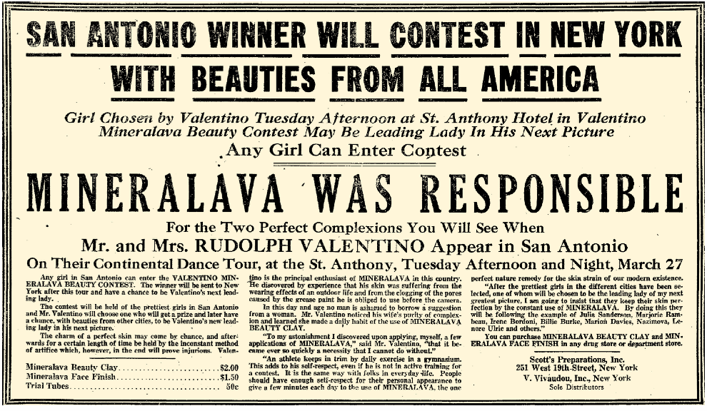 The deal was that Rudolph Valentino and his wife Natacha Rambova, a ballerina, actress, and a costume designer, would criss-cross the country giving dancing demonstrations while also promoting the beauty products of “Mineralava”