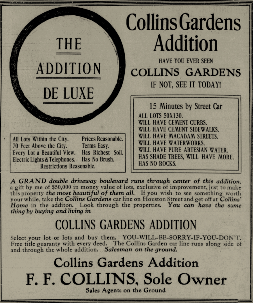 Today, the former location of her home and gardens is the Collins Gardens area of San Antonio, featuring a Library and Elementary School just south of the city off Nogalitos.