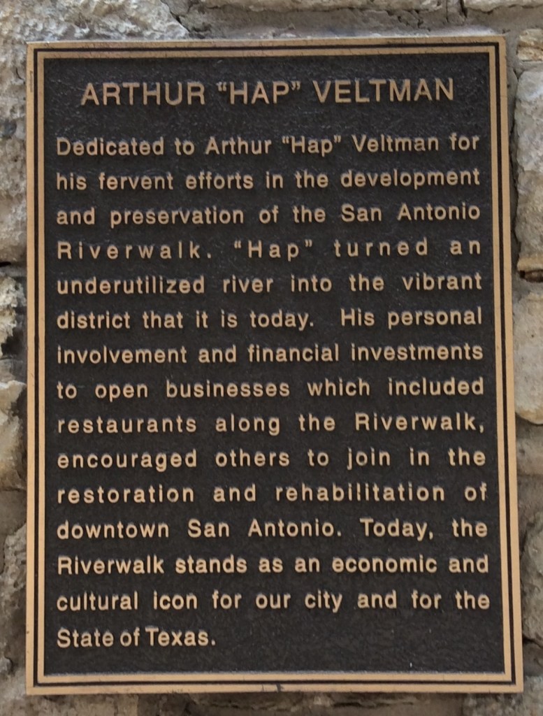 Hap Veltman passed away in 1988, but is remembered on the Riverwalk with a plaque to honor his contributions to this vital part of San Antonio.