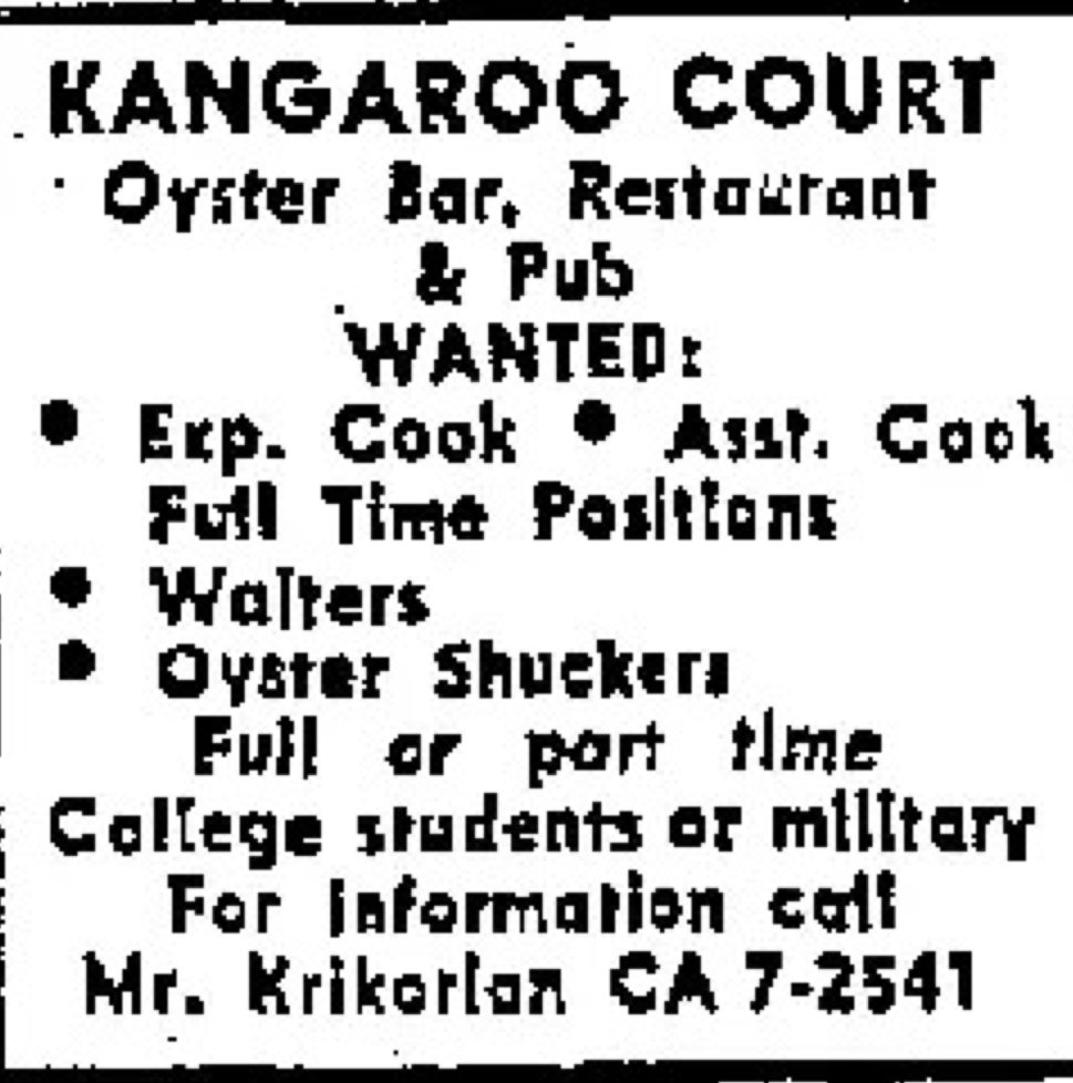 Kangaroo Court also hired mostly college students and military personnel to serve as wait staff, something that was quite unique in those days.