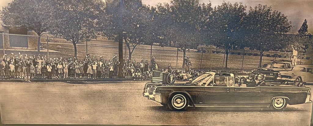 - During the motorcade along Broadway, the President’s limousine passed Cambridge Elementary School. An iconic photograph was taken by Major W.M. Kardegg capturing that moment. A print was given to retired businessman Jim Berg, and with $25,000 raised from mainly now-former students in the photo, he arranged for a permanent memorial to be constructed at that site where the school children had gathered.