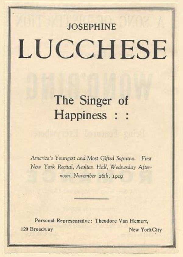She impressed everyone who heard her, and soon after, Josephine was cast in her first public recital on November 26th, 1919 at the Aeolian Hall in Manhattan, where she delighted the assembled audience with a selection of songs and arias.